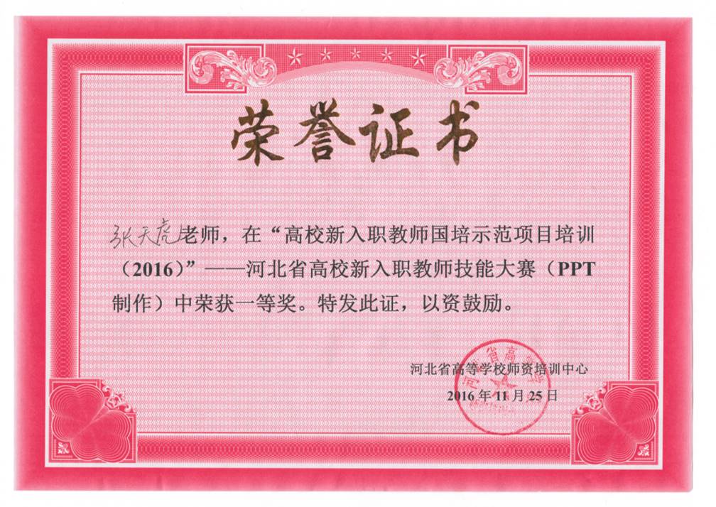 张老师是一个有心人。平时注重积累,学习了各种多媒体教学技能,并在河北省教育厅组织的高校新入职教师国培示范项目培训中获得了PPT制作一等奖。自2018年亚博体育