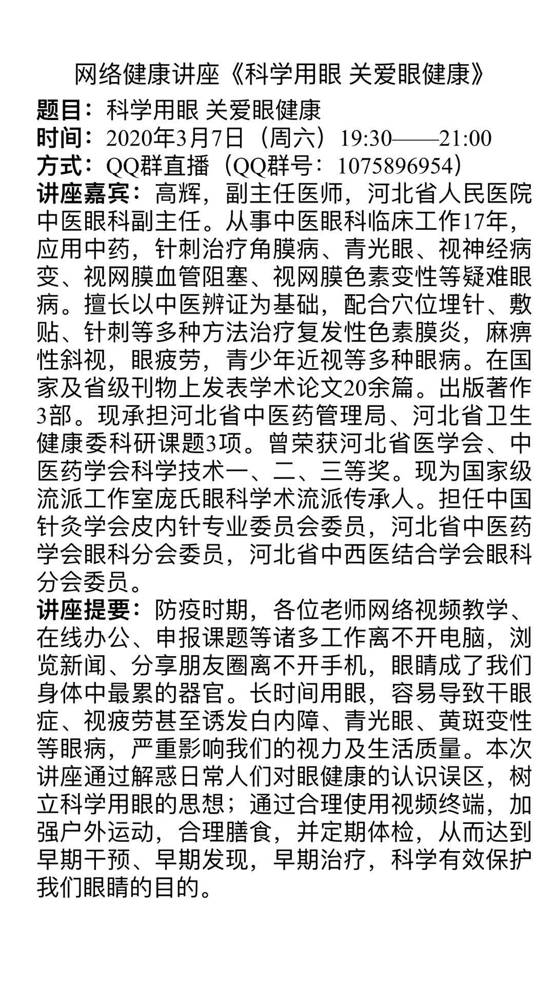 分工会紧扣“健康防疫”主题开展系列线上活动,一是《科学用眼 关爱眼健康》QQ群课堂讲座,与经济管理亚博体育