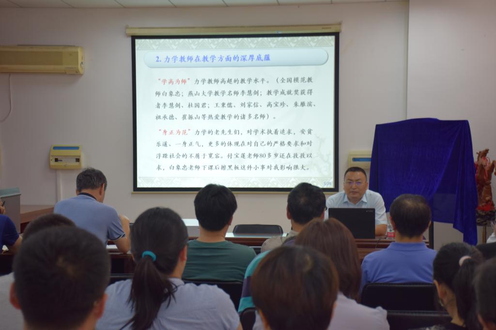 赵庆新老师以“师德内涵”开篇,通过讲述自己参加工作以来亲身经历的一个个建工故事,鲜活地呈现出力学教师在教学方面一直传承的严谨求实的优良传统。通过教师对教学的完美追求、对学生的无私关爱、老教师对青年教师的悉心指导三个方面,阐述了建工人为亚博体育 发展默默付出,用自己实际行动讲好建工故事的精神品质。最后号召系主任带好队伍,鼓励教师潜心教学,共同发展,统一在师德与专业发展的最大公约数下,形成一个活力四射的集体。