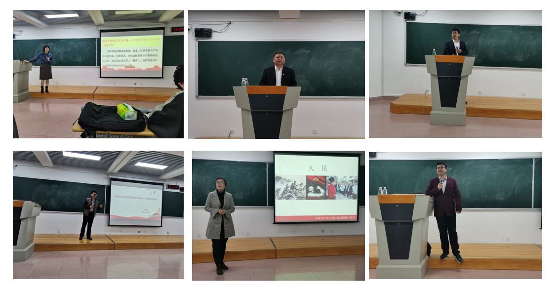 颜世晔、杨新宾、包巍、陈步伟四位老师。宗书记从四个方面论述了中国共产党为什么“能”,总结中国共产党是不忘初心、能够选贤任能、有自我革命精神、有强大执政能力的党;颜世晔老师梳理了党的发展脉络,列出党的发展重要时间节点并就重要事件进行详细讲解;王书记结合时代发展讨论当代青年的使命担当,告知学生机会与责任并存,要求学生党员做好表率作用,同时关心学生身体素质,指出:无体育,不建工;杨新宾老师全面分析了青年毛泽东的思想之路,在生活和思想方面展现出毛泽东完整的人物形象;包巍老师讲述了不同时期党的不渝的初心,为中国人民谋幸福,为中华民族谋复兴;陈步伟老师以七种错误思潮为例,分析其本质及危害,告诫学生要自觉辨识意识形态的错误思潮,提防意识陷阱。