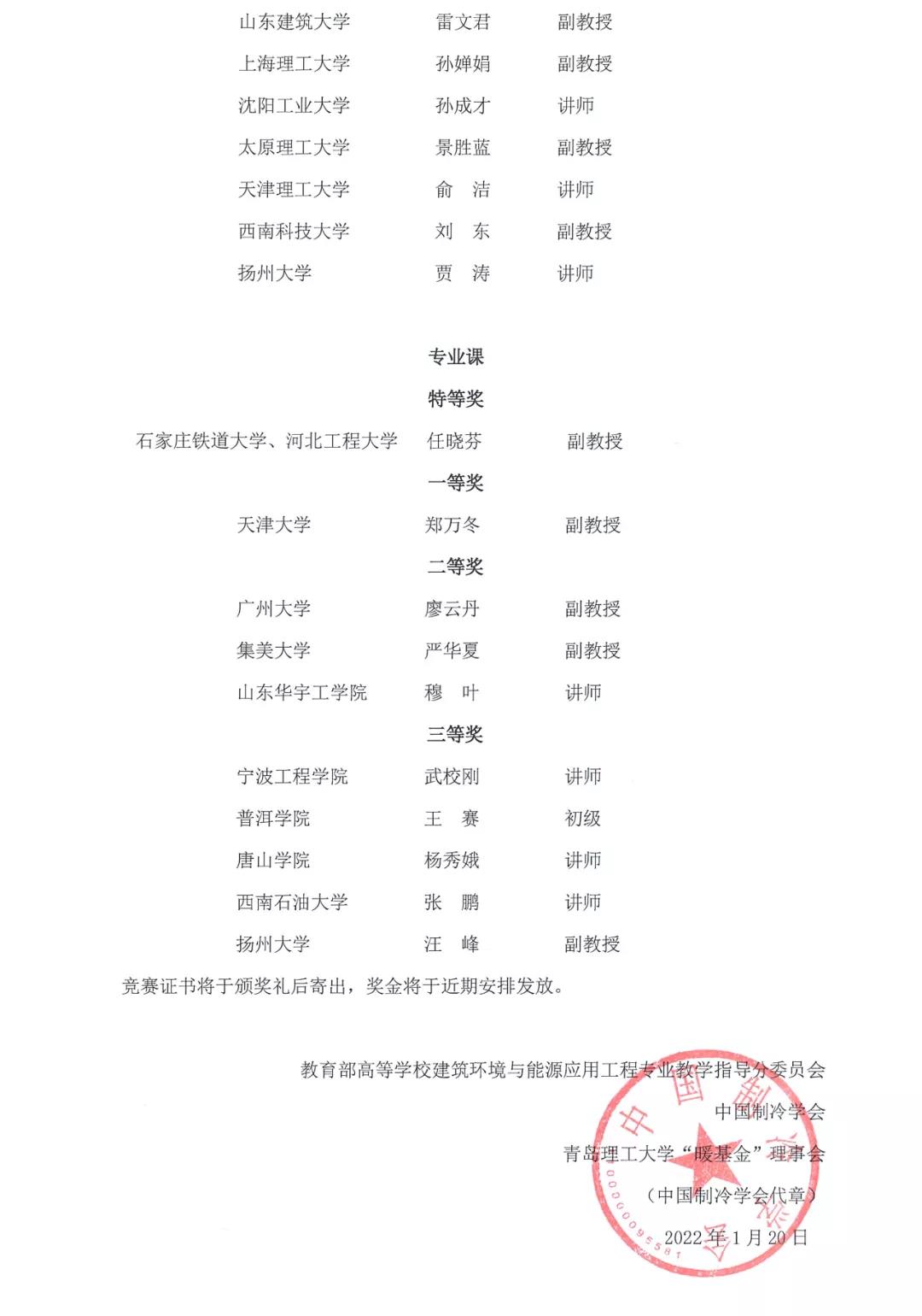 第三届全国建筑环境与能源应用工程专业青年教师讲课技能竞赛结果