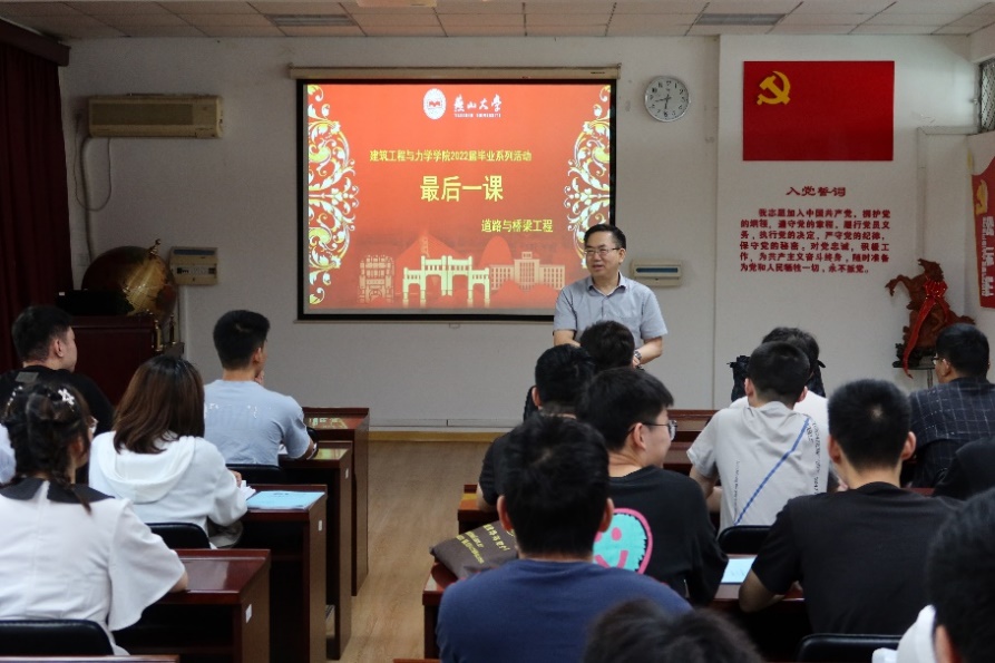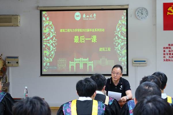 建筑环境与能源应用工程专业的“最后一课”邀请了最受同学们欢迎的“贵哥”张永贵老师。张老师希望同学们在今后的日子能关注时事、学会思考、明辨是非;鼓励同学们投身祖国建设、培养家国情怀、为中华民族伟大复兴事业而奋斗。引导同学们工作学习的目的是“近道”,要刻苦学习,找到属于自己的“道”,争做君子,问心无愧地“得”。最后,张老师嘱咐同学们要注意身体,一切事业和成就都基于良好的体魄,强身健体,才能幸福一生。