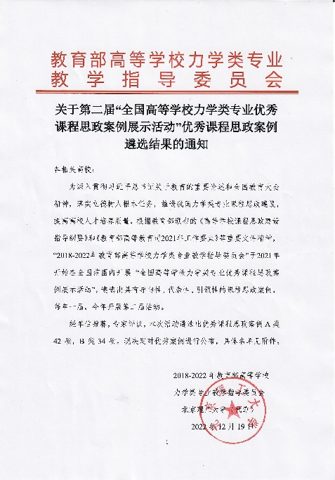 力学类专业教学指导委员会从2021年开始每年面向全国遴选具有导向性、代表性、引领性的课程思政案例。经单位推荐,专家评议,本次遴选出优秀课程思政案例A类42项,B类34项。