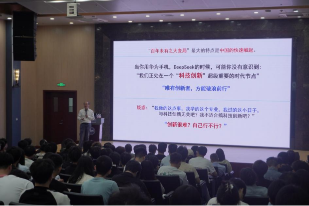 随后,文桂林教授结合自身科研经历,向大家介绍其科研项目的创新实践路径,鼓励大家要有远大抱负,思考社会需求,培养想象力,努力成为国家需要的创新型人才。他在与大家分享个人成长历程时,用亲身经历鼓励广大青年要树立终身学习的意识、勇于突破学科壁垒,将跨领域知识转化为创新实践的驱动力。讲座过程中,在场师生全神贯注,不时记录要点。在问答环节,同学们踊跃提问,文桂林教授就本科到研究生的角色转换、研究生如何开展创新研究工作等问题给出了宝贵建议,现场互动热烈,思维碰撞不断。