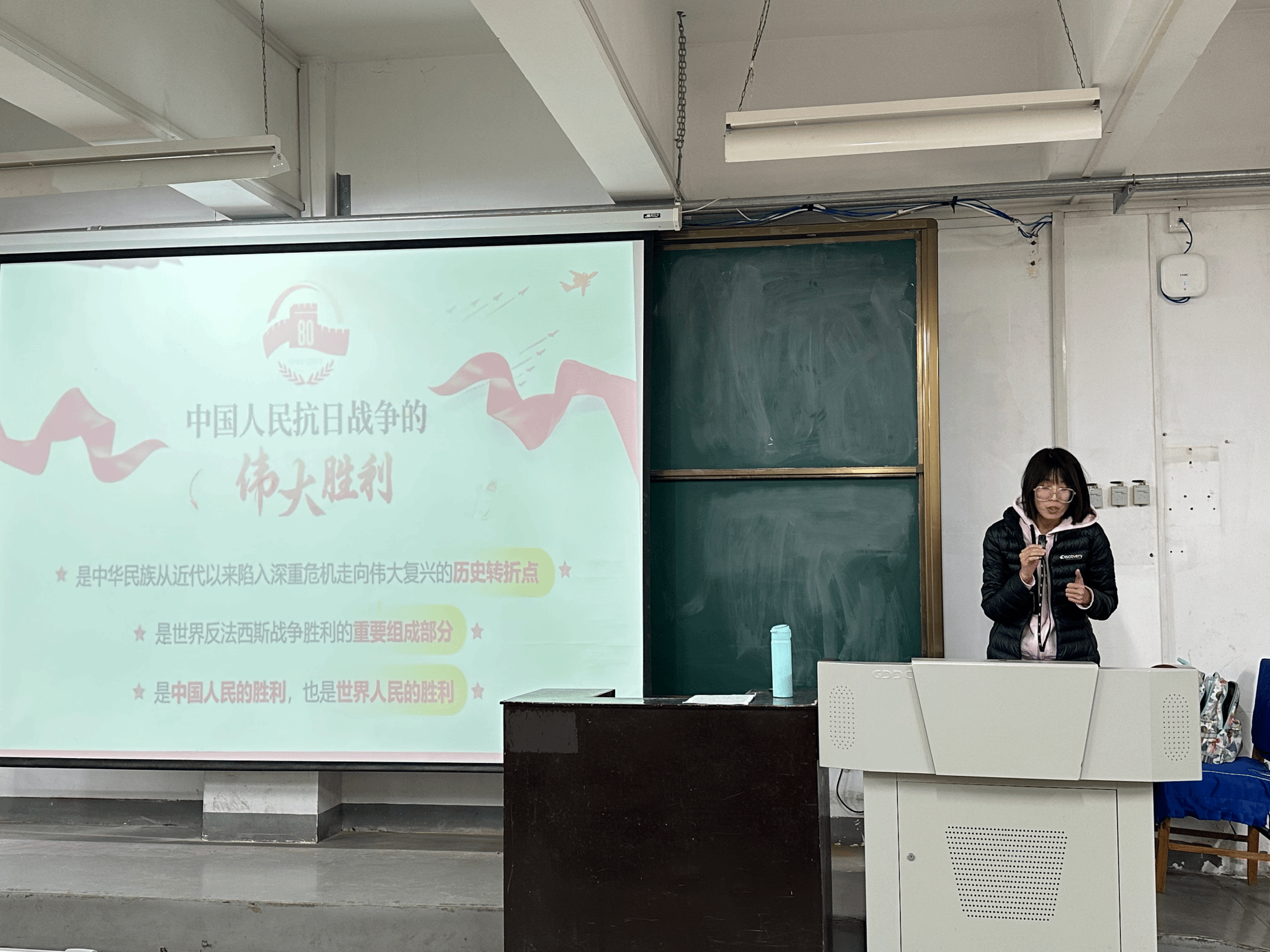 活动中,张娟娟老师梳理14年抗日战争的艰难历程,从九一八事变后的顽强抗争到全面抗战爆发后的浴血奋战,重点阐释中国共产党作为全民族团结抗战的中流砥柱,如何提出全面抗战路线、开辟敌后战场以及凝聚民族精神,同时清晰阐明中国战场作为世界反法西斯战争的东方主战场,为全球抗战胜利作出的巨大牺牲和卓越贡献,让学生深刻认识抗战胜利的历史必然。