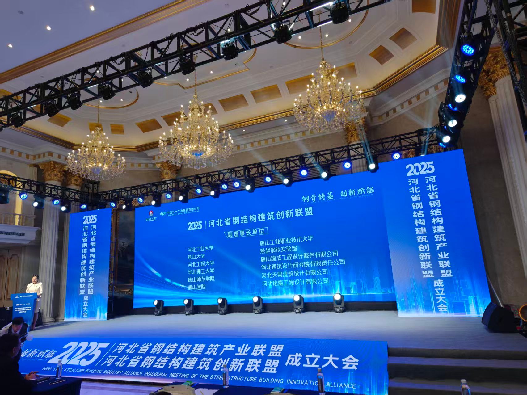 中国钢铁工业协会副会长夏农、装配式钢结构民用建筑产业技术创新战略联盟名誉理事长郝际平、唐山市副市长张涛等领导先后致辞。中国二十二冶总经理、党委副书记慈国强作联盟筹备工作报告。中国中冶装配式建筑(河北)技术研究院常务副院长、中国二十二冶装配式分公司党委书记刘冲代表理事长单位作就职发言。