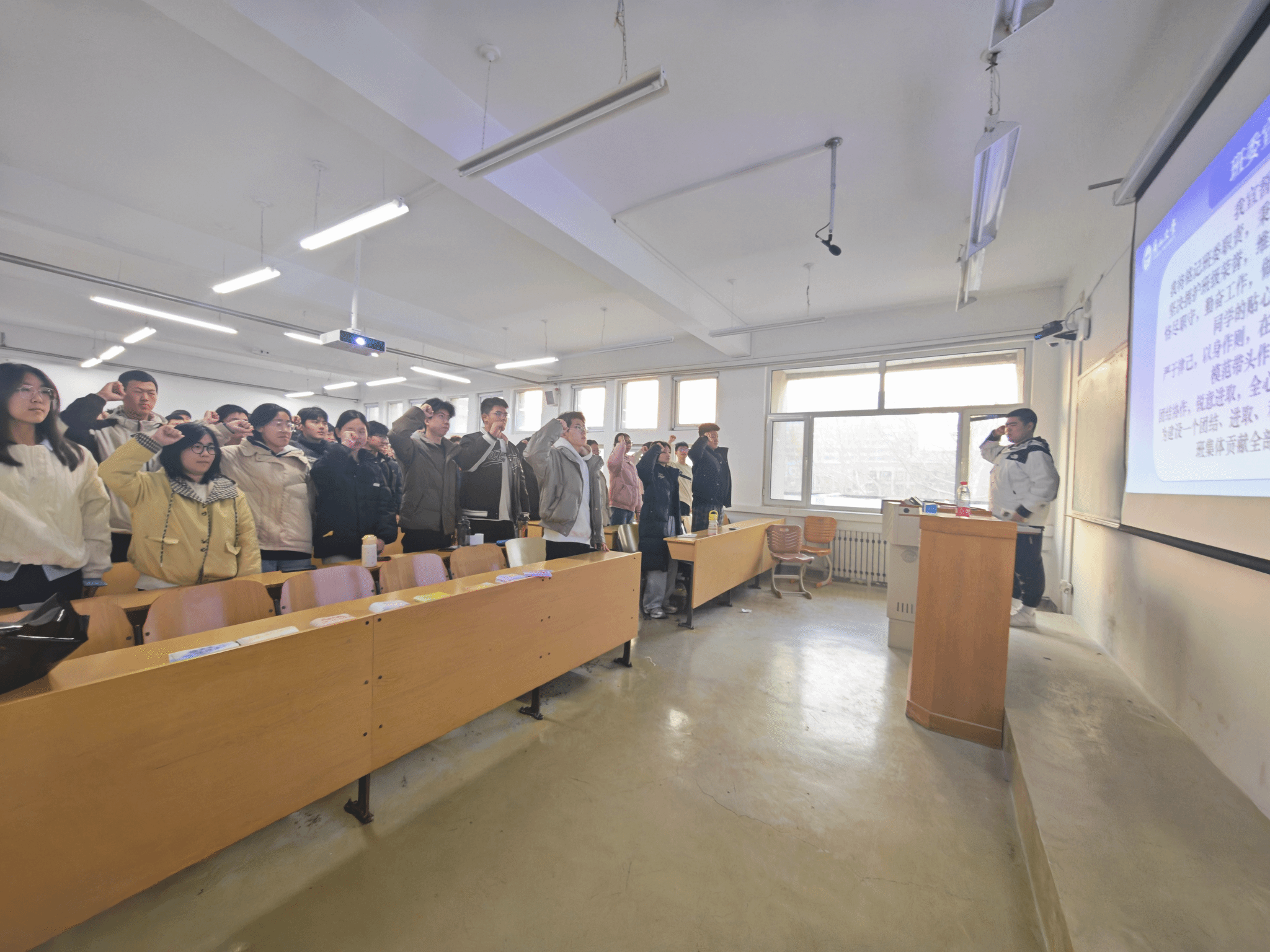 会议最后,全体学生干部在领誓人的带领下,高举右拳,进行了庄严的集体宣誓。铿锵有力的誓言展现了2025级学生干部昂扬向上的精神风貌和矢志服务同学、助力亚博体育