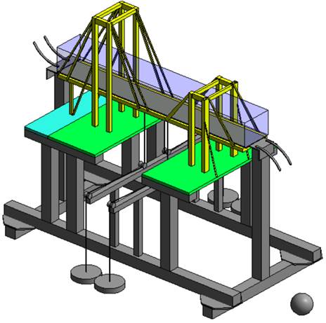 保持上一级竖向静载荷作用,施加移动荷载,在满足加载要求的前提下,铅球登上到达桥岸则第三级加载成功。