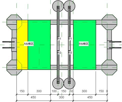 a.载荷作用点:桥跨度区域分别设置有两对加载点A1和A2、B1和B2,每对加载点的平面投影位置对称布置在加载台中轴线两侧,距离中轴线的距离均为75mm;